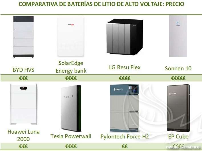 Un último criterio, pero no por ello menos importante, sería el precio. Lo que se debería buscar es un equilibrio entre la calidad que se necesita y del presupuesto del que se dispone. Si bien el precio de las baterías va variando, para poder hacer la comparativa hemos echado mano de precios de mercado que nos sirvieran de orientación. El objetivo no es tanto dar una cifra exacta sino establecer una comparación entre los diferentes precios que nos hemos encontrado de los sistemas de almacenamiento a comparar.
