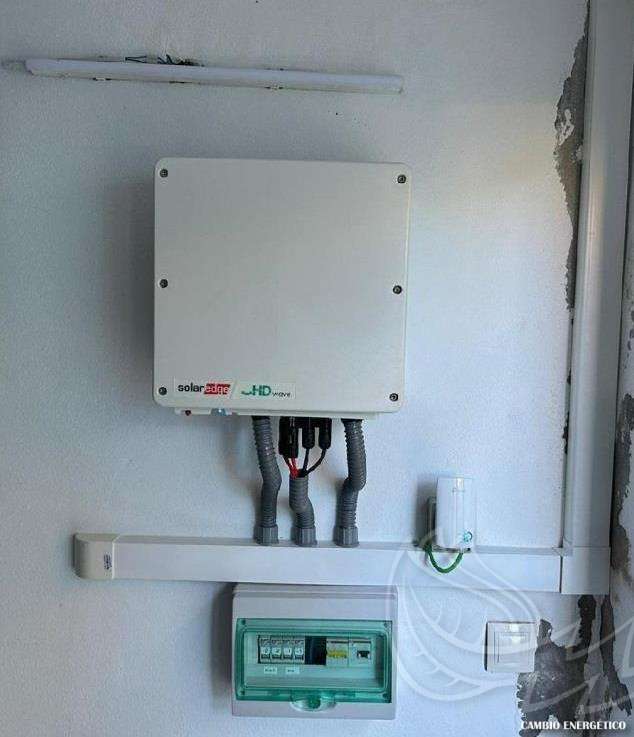 Para convertir la energía de corriente continua de los paneles solares en corriente alterna para utilizar en esta vivienda, hemos instalado un inversor monofásico SE8000H del fabricante SolarEdge. Este inversor tiene una potencia nominal de salida de 8kW y puede gestionar un campo fotovoltaico de hasta 16kWp, lo que te permite sobredimensionar tu instalación en un 200%. Y la eficiencia máxima de este inversor es del 99,2%.